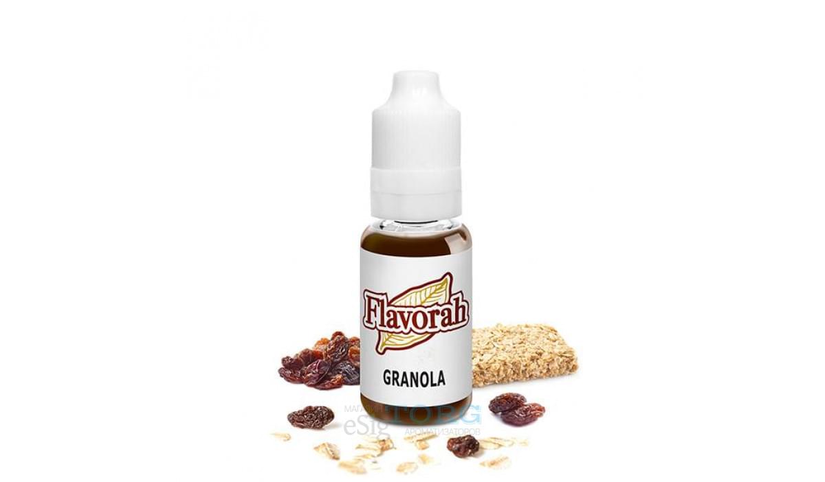Granola — смесь из овсяных хлопьев, орехов и меда. Гранола — традиционный сухой завтрак в США. Перед употреблением смесь, как правило, запекают, чтобы она стала хрустящей и приобрела оригинальный вкус. Его довольно точно повторяет ароматизатор Granola от Flavorah. Действительно приятный округлый , мягкий аромат гранолы , без хруста .В послевкусии также присутствуют пшеничные и изюмные ноты. Хорошо сочетается с фруктами и йогуртами / кремами . Почти как испечённая , тёмная гранола . Тело и чистый вкус гранолы .